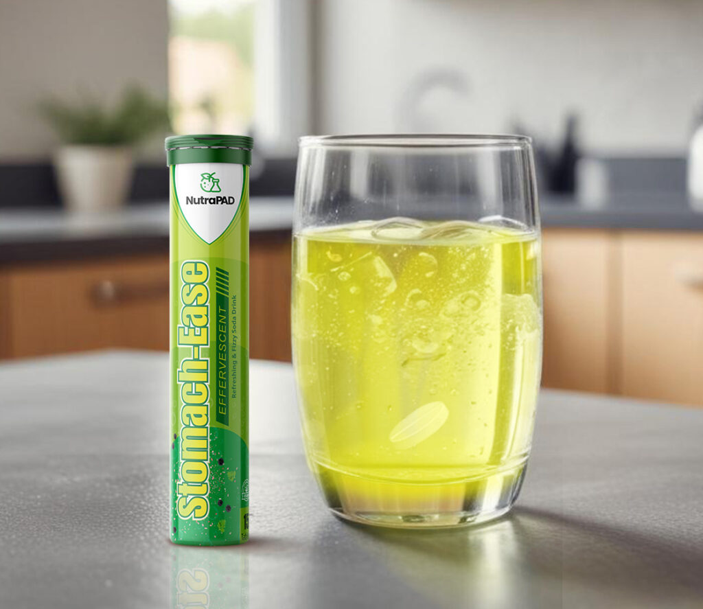 Soothe your gut with NutraPAD’s Stomach-Ease Effervescent tablets. Just dissolve in water to create a refreshing, fizzy soda drink that supports and maintains your digestive health with every sip.